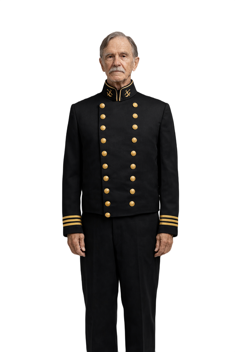 This striking 1940s men's military jacket is crafted from smooth black wool. Featuring a structured double-breasted design with gold buttons and stunning anchor embroidery on the collar, it exudes elegance and history. The jacket falls at the hip and includes gold stripes on the cuffs for added detail. Perfect for layering, this vintage piece reflects the military fashion of its time, making it a standout addition to any wardrobe. It's in excellent condition, tailored for a medium fit.