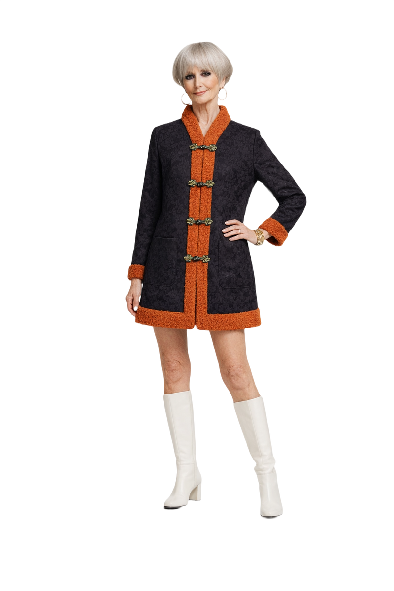 This stunning 1960s black floral jacquard jacket showcases vibrant orange textured trim along the collar and cuffs. Perfect for layering, it boasts a straight fit and elegant V-neckline. Ideal for both casual and semi-formal occasions, this jacket adds a unique touch to any outfit. With its classic design and eye-catching patterns, it's a must-have for vintage enthusiasts.