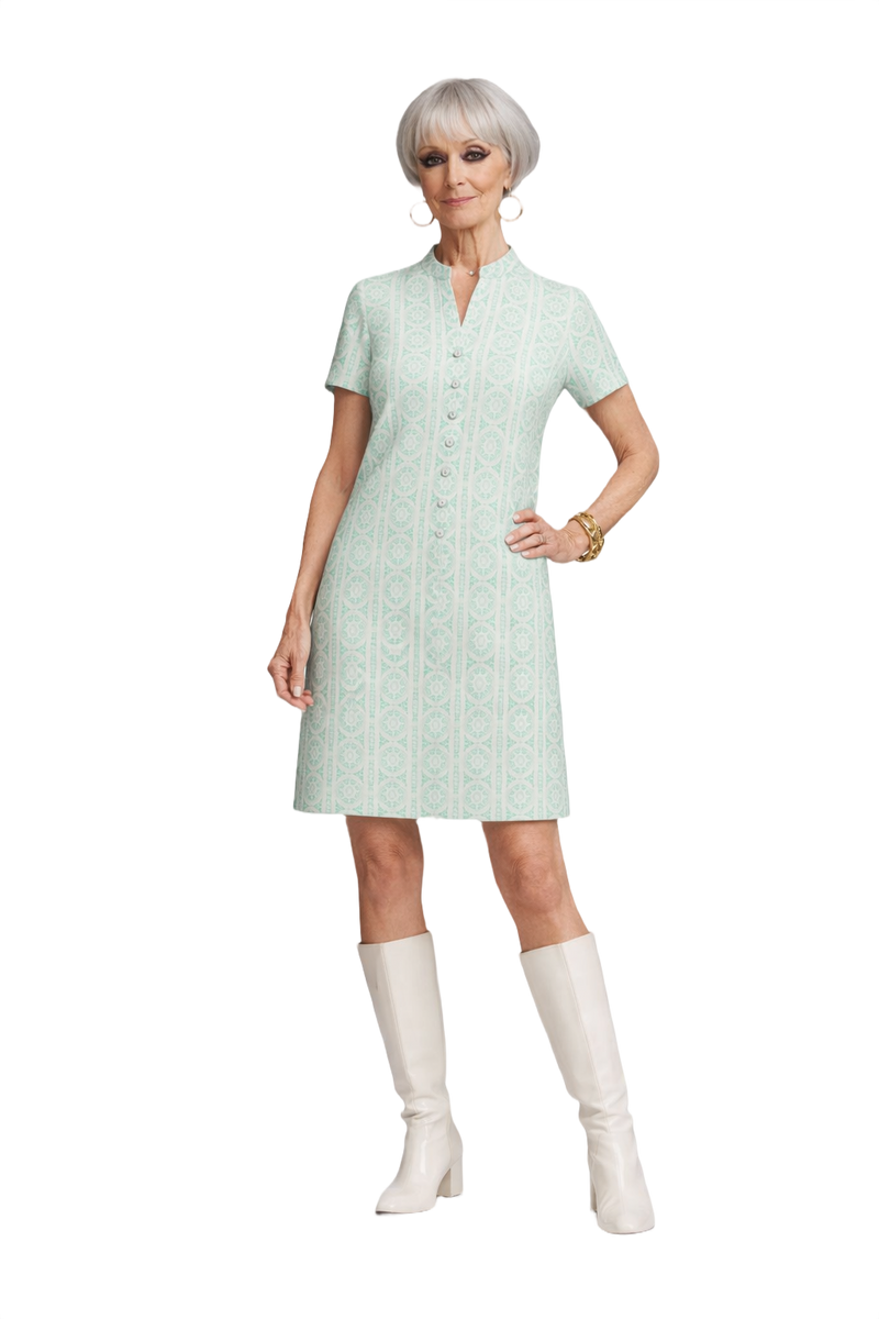 Step back into the '60s with this vibrant women's shift dress featuring a stunning green and white geometric pattern. Elevate your wardrobe with this iconic piece from the Mod era, exuding a youthful charm that celebrates bold patterns and fun silhouettes. Ideal for pairing with minimalist accessories and retro footwear.