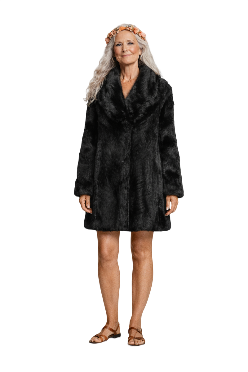 Embrace vintage elegance with this oversized black fur coat from the 1970s. Featuring dramatic shoulders and a luxurious collar, this mid-thigh coat offers both style and comfort. Its bold textured pattern and boxy silhouette make it a standout piece for any wardrobe.