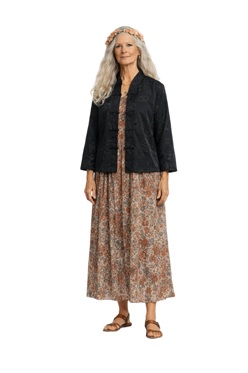 Elevate your wardrobe with this reversible black&cream satin jacket featuring a smooth texture and elegant floral print. The tailored fit and traditional frog closures enhance its chic style, perfect for any occasion. Originally from the 1990s, this jacket boasts a mandarin collar and full-length sleeves.