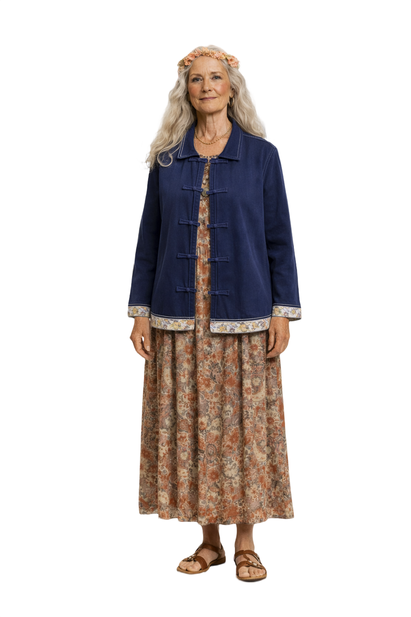 This 1970s women’s jacket showcases a navy blue cotton fabric, featuring toggle closures and beautiful floral embroidered trim at the hem and cuffs. Its smooth texture and relaxed fit make it a perfect piece for various casual occasions.
