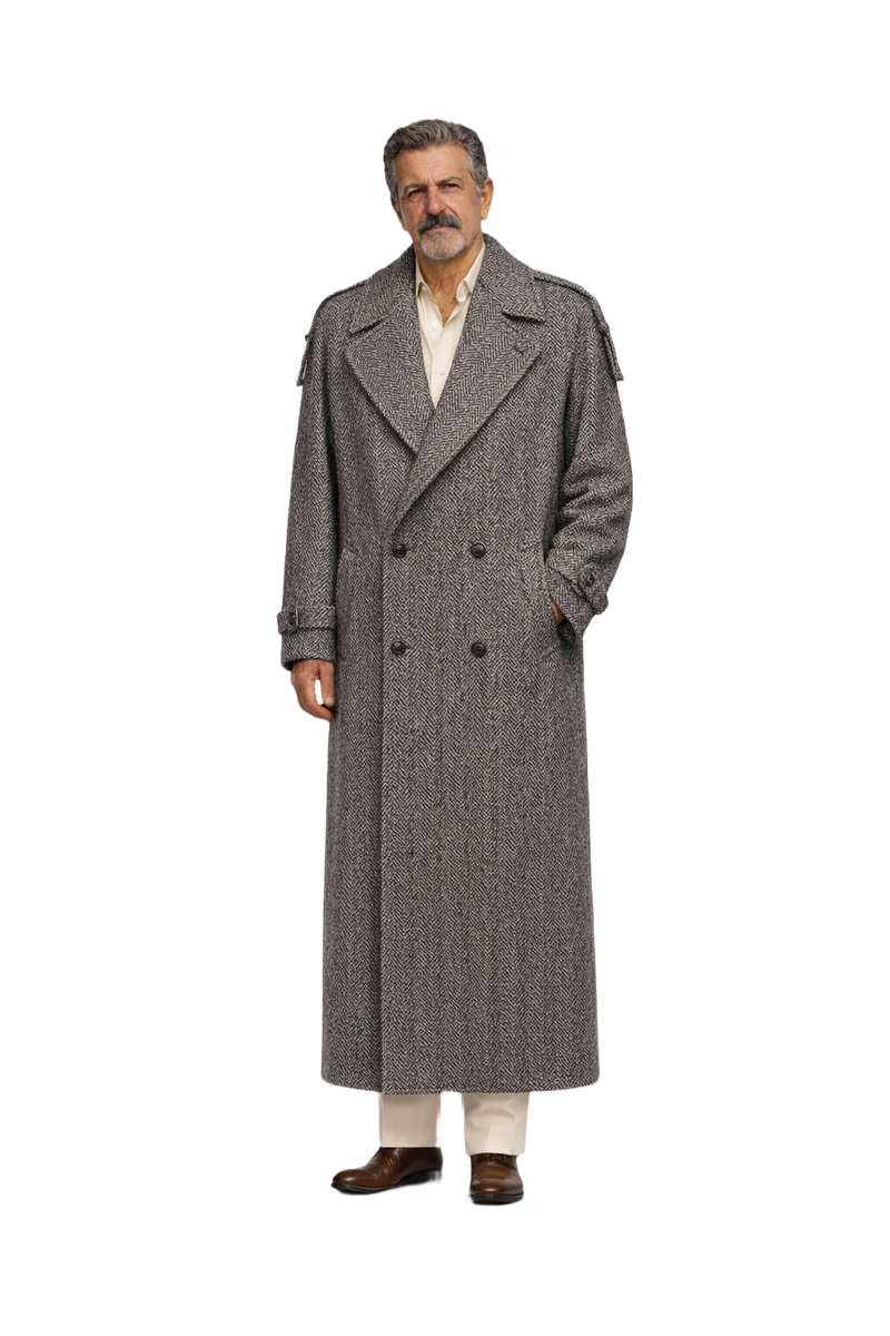 Step into the power of the 1980s with this oversized herringbone wool coat, featuring striking large lapels, padded shoulders, and epaulettes. Its knee-length design and textured wool bring a sophisticated edge to any ensemble.