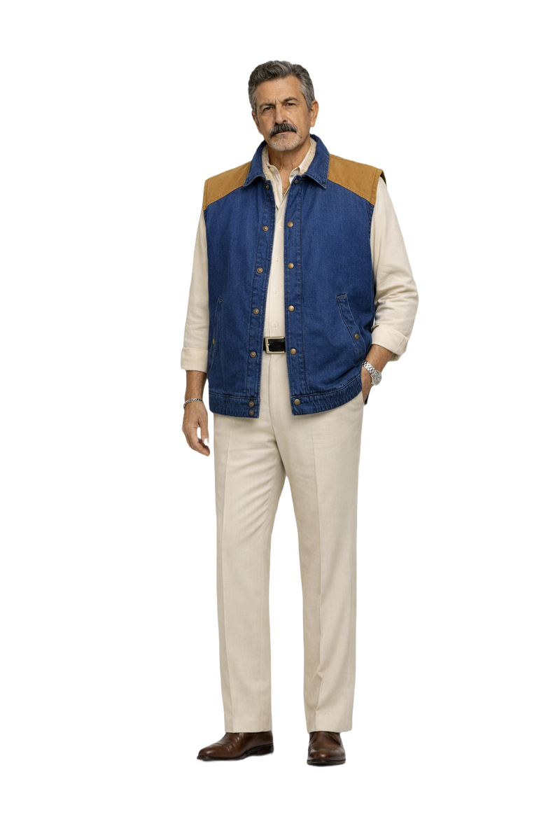 Discover this YSL Sport denim vest, featuring a cozy sherpa lining and eye-catching contrasting shoulder panels. The classic blue and beige colors come together in a hip-length design with button closures, perfect for layering. This vest embodies the bold style of the 1980s, pairing well with a casual look or adding texture to your collection. A great choice for every season!