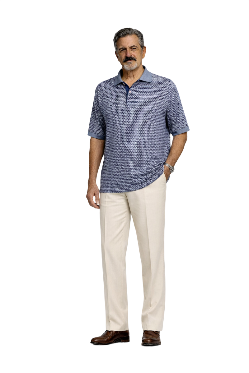 Step into the 1980s with this loose-fitting blue and white polo shirt. Featuring a classic knit collar with a golfer print and a button placket, this piece is perfect for a casual day out or a laid-back gathering. With its geometric pattern and hip-length style, this polo seamlessly captures the essence of the era. Dress it up or down, and let its comfort and unique design set you apart from the crowd!