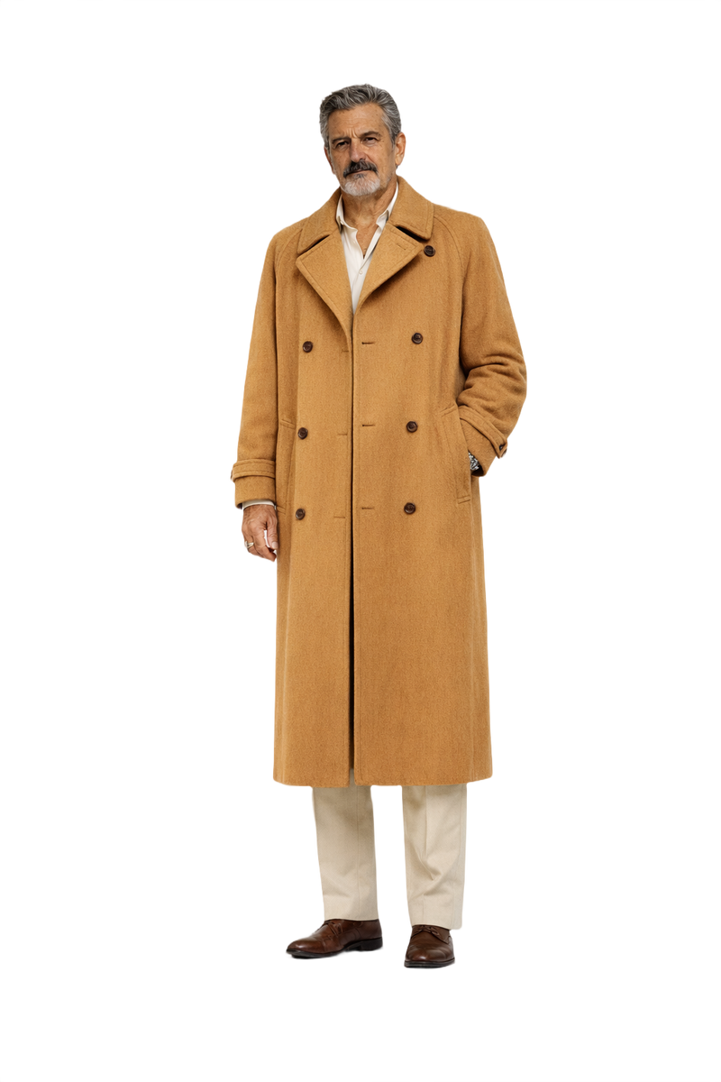 This camel wool coat with a double-breasted front and structured shoulders is perfect for enhancing your classic menswear collection. With calf-length styling and textured wool, it combines function and fashion effortlessly. This coat showcases a rich, solid color and is designed with raglan sleeves and buttoned cuffs for a stylish finish.