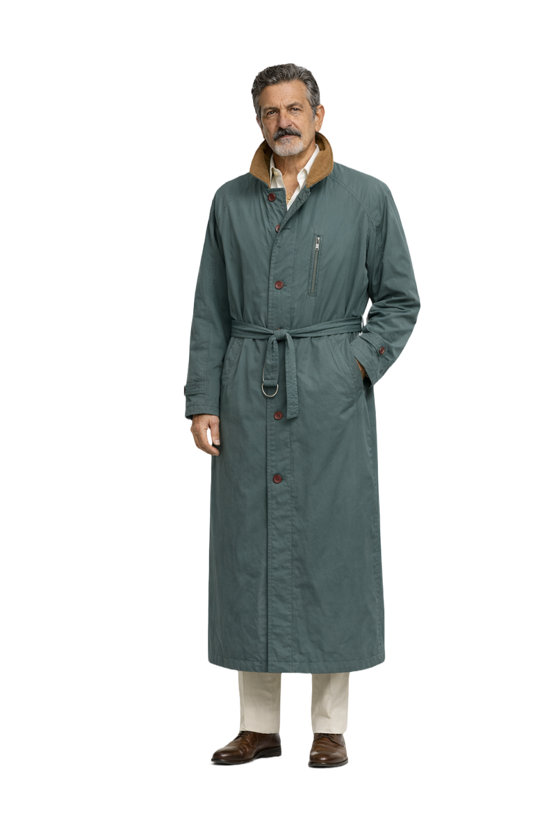 Elevate your outerwear collection with this 1980s dark green Dior coat. Featuring a belted waist and camel contrast collar, this knee-length coat is perfect for layering while maintaining a clean look. This men's coat showcases a loose fit, ideal for a casual day out or a night on the town. Embrace the vintage charm of 1980s styling with a muted color palette that pairs effortlessly with various outfits.
