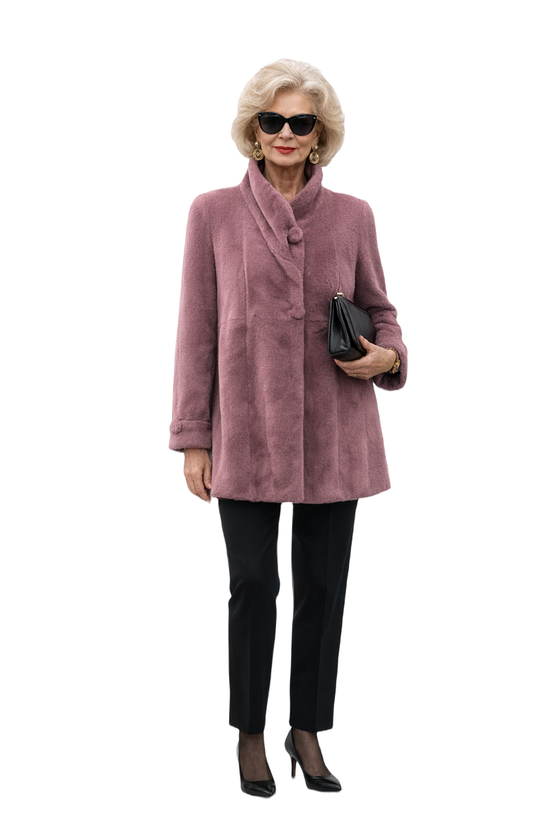 Step into the spotlight with this luxurious dusty rose purple faux fur coat from the 1980s! Its plush texture and oversized fit exude high-powered sophistication, perfect for making a statement. Featuring dramatic shoulders and a rounded shawl collar, this coat combines vintage charm with modern appeal, making it an ideal addition to any wardrobe.