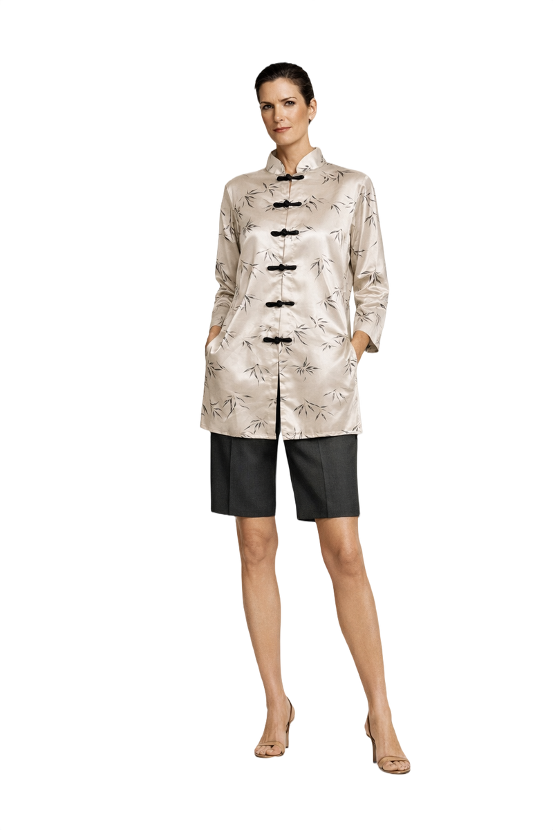 Elevate your wardrobe with this luxurious cream blouse from the 1990s. Crafted from a smooth fabric, it features an elegant bamboo print, mandarin collar, and distinctive toggle button closure that showcases sophisticated design. Perfect for a fashionable night out or a stylish office setting.