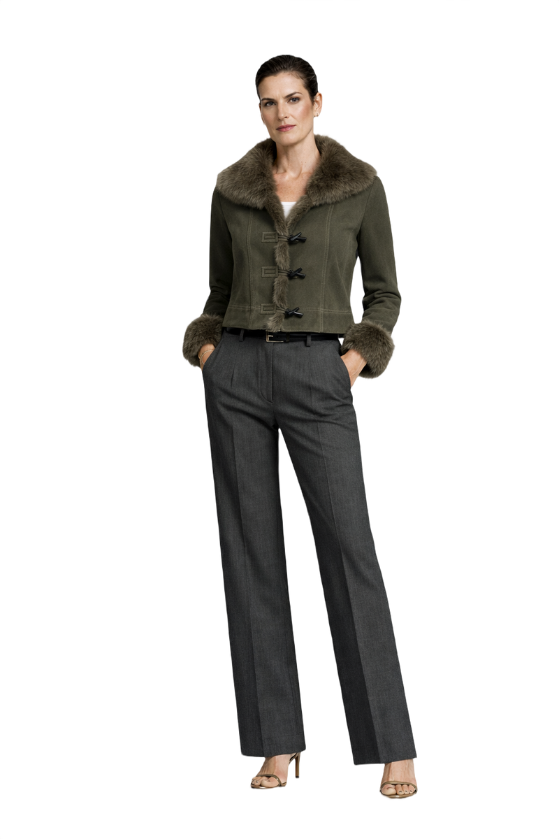 This stunning olive green suede jacket features a luxurious fur inner layer for added warmth. Embrace the bold style of the 90s with this jacket that effortlessly blends elegance and comfort.